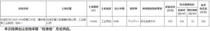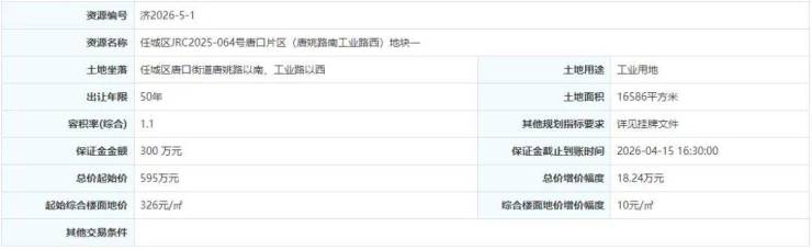 土地位于:任城区唐口街道唐姚路以南、工业路以西;土地面积:16586㎡(约25亩);土地用途:工业用地;出让年限:50年;容积率:不大于1.1;起始价:595万元,综合楼面价起价:326元/㎡;最终成交价为:595万元(约24万元/亩),综合楼面地价成交价:326元/㎡;溢价率:0.0%;