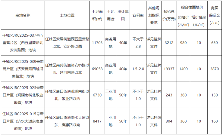 4. 任城区JRC2025-015号唐口片区(济水大道东唐惠路南)地块:2025年11月25日9时00分至2025年12月5日9时30分;