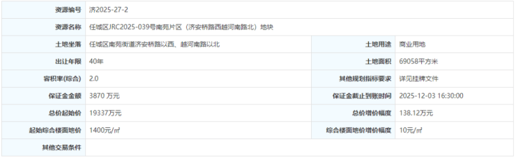 2. 任城区JRC2025-039号南苑片区(济安桥路西越河南路北)地块:2025年11月25日9时00分至2025年12月5日9时10分;
