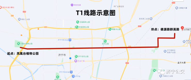 T1路:由“凤凰台植物公园”发车,沿洸河路向东至崇文大道,沿崇文大道向东至海川路,沿海川路向北至群英路,沿群英路向东至德源路,沿德源路向北至终点站“德源路群英路”,早高峰7:00、7:35(上行);6:55、7:15、7:35(下行),晚高峰17:10、17:40、18:10(上行);17:25、17:45(下行)。