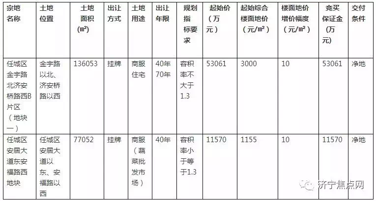 土地位于:任城区安居大道以东、安福路以西;土地面积:77052㎡(约116亩);土地用途:商服用地;出让年限:40年;容积率小于等于1.3;起始价:11570万元,综合楼面价起价:1155元/㎡;交付条件为净地;最终成交价为:11570万元(约100万元/亩),综合楼面地价成交价:1155元/㎡;