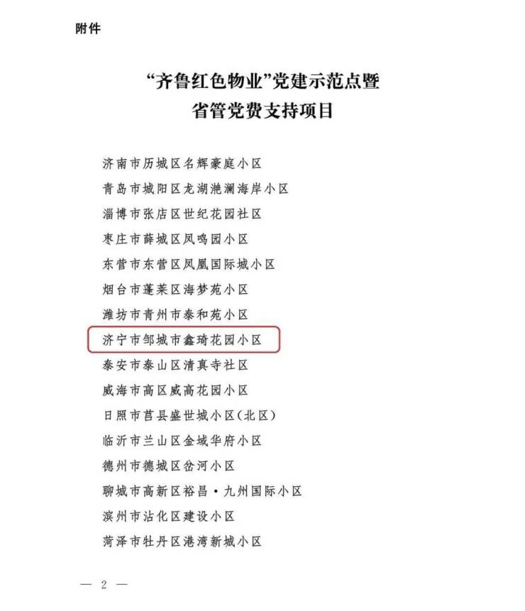 近日,山东省物业服务行业党委印发《关于公布“齐鲁红色物业”党建示范点暨省管党费支持项目名单的通知》,经各市物业服务行业党委推荐、省物业服务行业党委审核,确定16个小区为“齐鲁红色物业”党建示范点暨省管党费支持项目,其中济宁市邹城鑫琦花园小区入选。