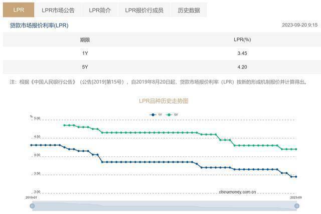 9月20日,中国人民银行授权全国银行间同业拆借中心公布,2023年9月20日贷款市场报价利率(LPR)为:1年期LPR为3.45%,5年期以上LPR为4.2%。与上月相比,9月1年期、5年期以上LPR均维持不变。