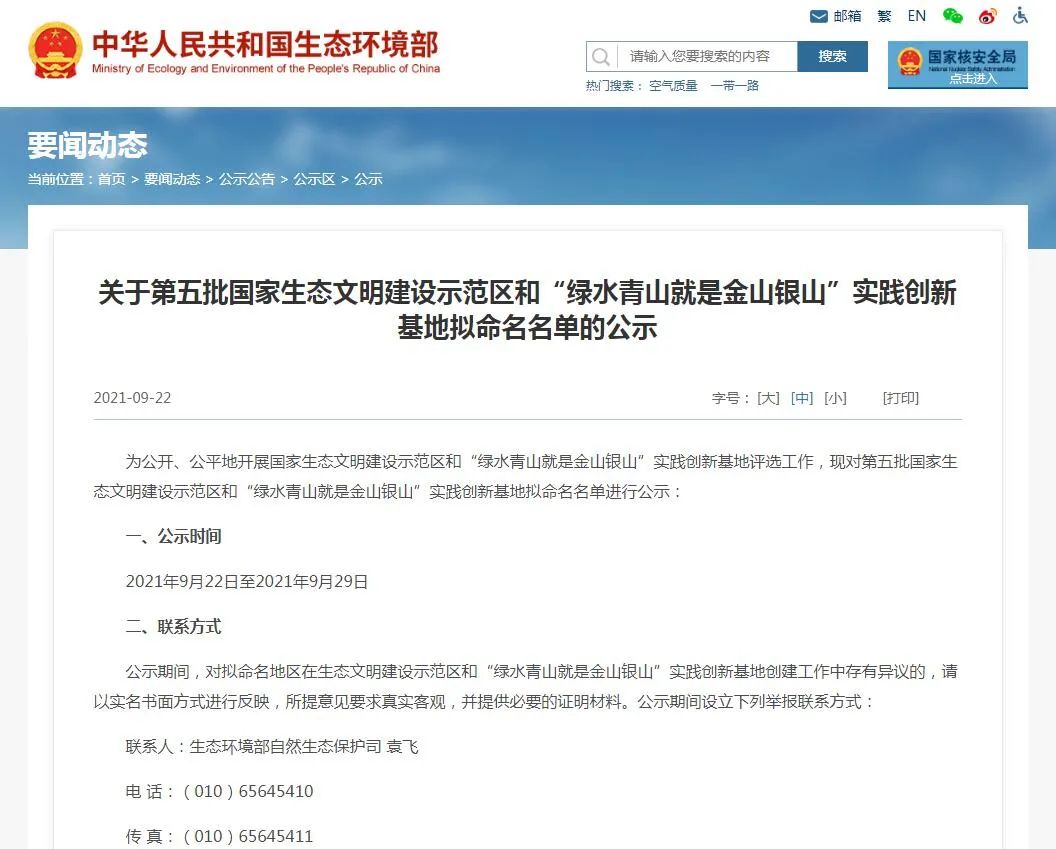 关于第五批国家生态文明建设示范区和“绿水青山就是金山银山”实践创新基地拟命名名单的公示