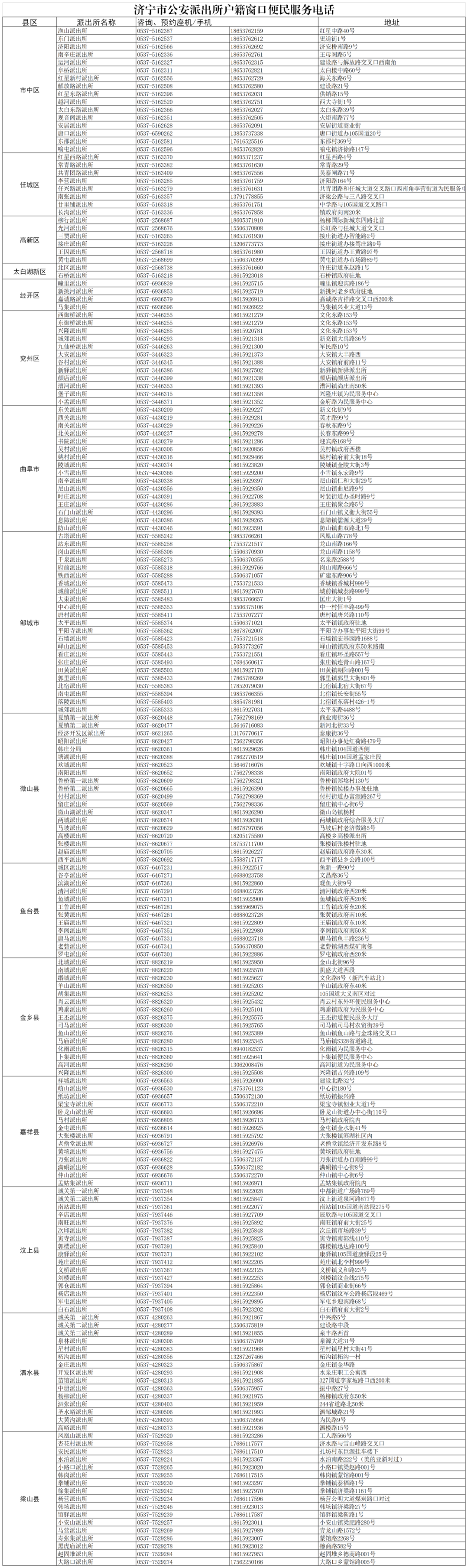 济宁市公安派出所户籍窗口便民服务电话