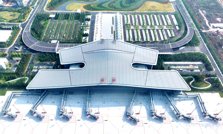 济宁大安机场位于兖州区大安镇,为4C级民用支线机场,场区占地面积2909亩,跑道长2800米、宽45米,航站楼面积29700平方米,建设有16个C类机位(含除冰和隔离机位)、8个廊桥。本期工程按照2025年旅客吞吐量260万人次,货邮吞吐量7000吨目标设计。近期规划目标年为2035年,按满足年旅客吞吐量600万人次、年货邮吞吐量4万吨进行规划,国内航站楼67000平方米、国际航站楼8000平方米。远期规划目标年为2050年,按满足年旅客吞吐量1400万人次、年货邮吞吐量10万吨进行规划,远期规划航站楼151000平方米,建设综合交通中心,引入轨道交通。
