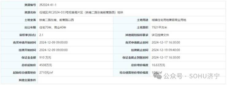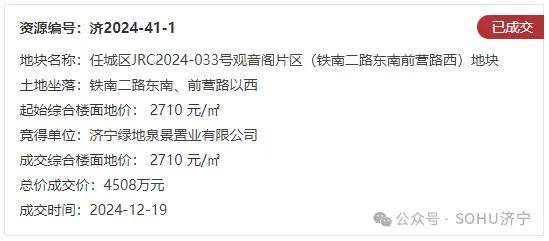 任城区JRC2024-033号观音阁片区(铁南二路东南前营路西)地块【济宁绿地泉景置业有限公司竞得】