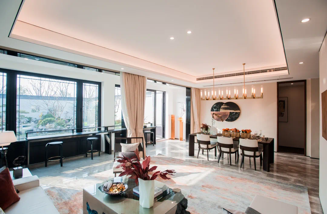 悠闲午后在院中落座,一院风景入怀。三五知己偶遇彼此闲暇时光,在超大面宽的雅致客厅里沏清茶一壶,悦清风阳光,坐揽天地宽。伴着茶香,共话人生趣事,俯仰即拾庭院精致,推杯换盏谈笑间,景色已入怀。
