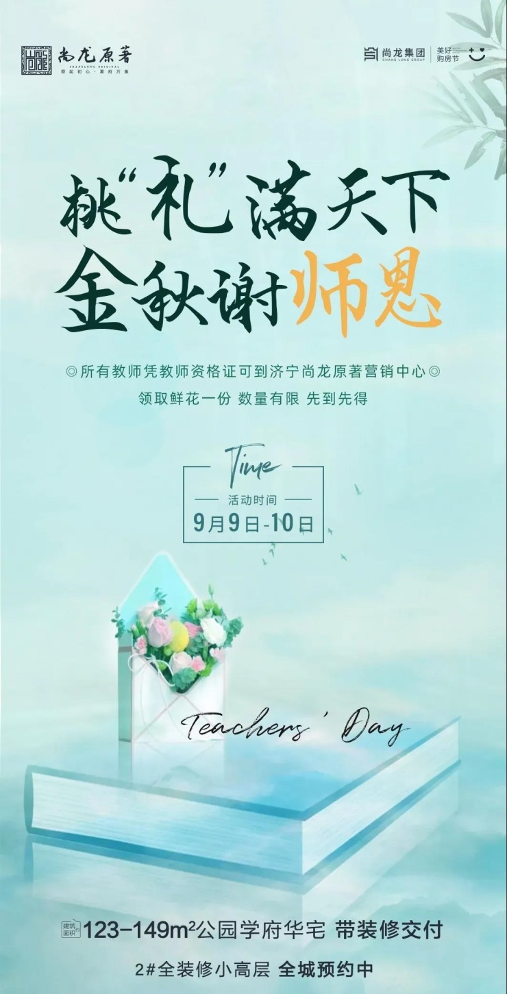 所有教师凭教师资格证可到济宁尚龙原著营销中心,领取鲜花一份,数量有限,先到先得。活动时间:9月9日-10日。建面约123-149㎡公园学府华宅,带装修交付。2#全装修小高层,全城预约中。