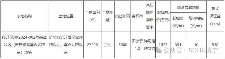 土地位于:济宁经济开发区宏祥路以北、嘉合北路以东;土地面积:27426㎡(约41亩);土地用途:工业用地;出让年限:50年;容积率不小于1.0;起始价:1073万元,综合楼面价起价:391元/㎡;最终成交价为:1073万元(约26万元/亩),综合楼面地价成交价:391元/㎡;溢价率:0.0%;