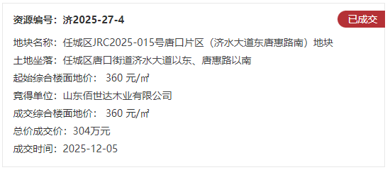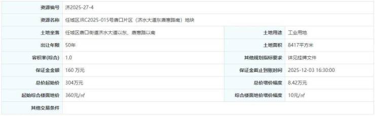 土地位于:任城区唐口街道济水大道以东、唐惠路以南;土地面积:8417㎡(约13亩);土地用途:工业用地;出让年限:50年;容积率不小于1.0;起始价:304万元,综合楼面价起价:360元/㎡;最终成交价为:304万元(约23万元/亩),综合楼面地价成交价:360元/㎡;溢价率:0.0%;