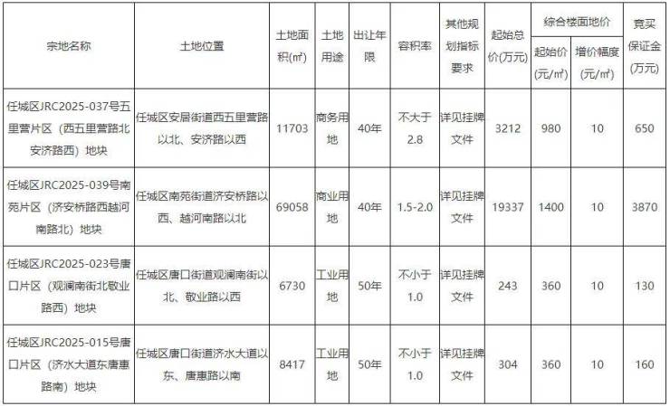 从4宗地块的具体分布上看,均位于任城区。从土地用途来看,1宗商务用地、1宗商业用地、2宗工业用地。土地总面积为95908㎡,约144亩;起始价为23096万元。