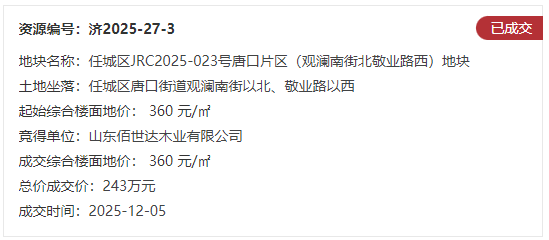 地块三:任城区JRC2025-023号唐口片区(观澜南街北敬业路西)地块【山东佰世达木业有限公司竞得】