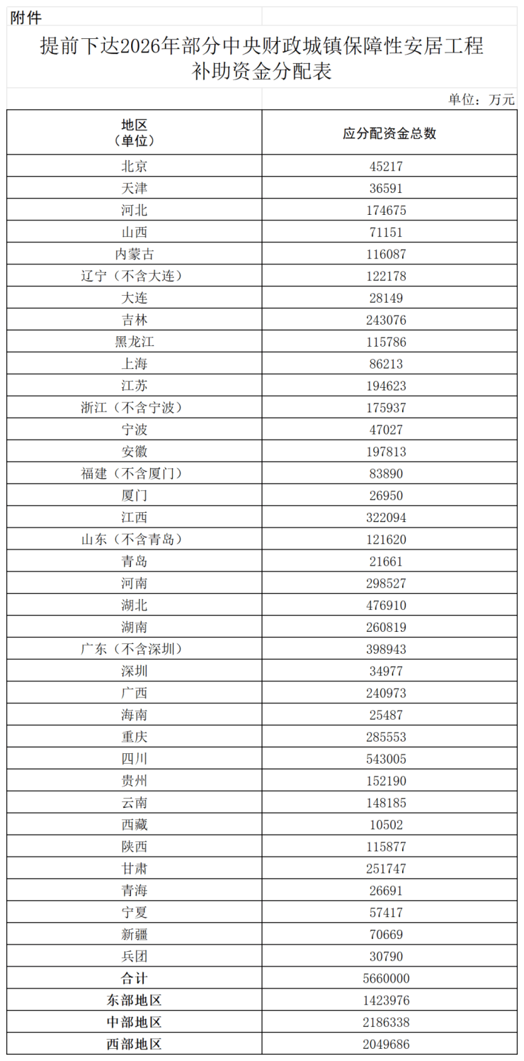 附件:提前下达2026年部分中央财政城镇保障性安居工程补助资金分配表