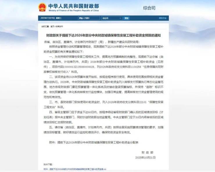 按照资金管理办法和预算管理规定,现就提前下达2026年部分中央财政城镇保障性安居工程补助资金预算的有关事宜通知如下: