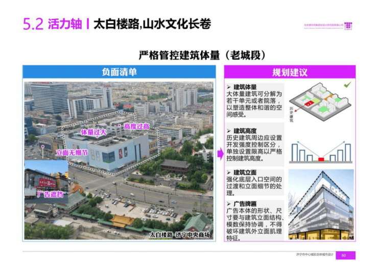 通过规划评估梳理现状问题,充分利用大数据、公众参与等方法对济宁城市风貌进行科学研判,勾勒出“文化脉、蓝绿网、发展轴”的城市特色空间骨架,并对城市空间格局、建筑风貌、建筑色彩、夜景照明等方面提出具体要求,建立“严格、中等、一般”三级管控体系,引导调控城市空间格局优化、协调风貌特色塑造,促进中心城区能级提升和都市区融合发展。