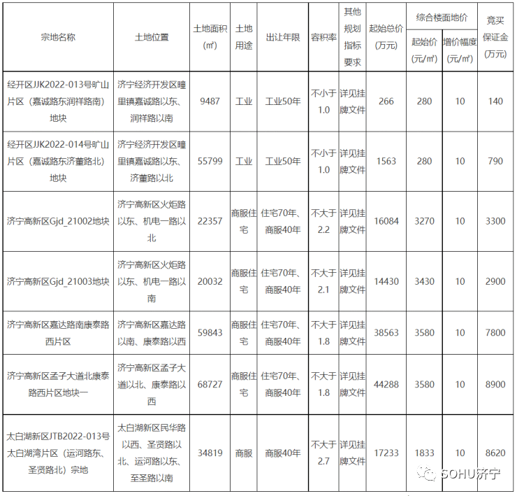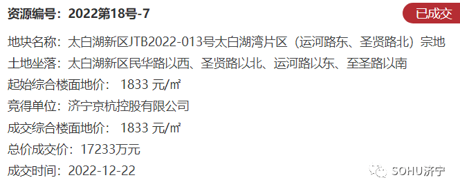 土地位于:太白湖新区民华路以西、圣贤路以北、运河路以东、至圣路以南;土地面积:34819㎡(约52亩);土地用途:商服用地;出让年限:40年;容积率不大于2.7;起始价:17233万元,综合楼面价起价:1833元/㎡;最终成交价为:17233元(约331万元/亩),综合楼面地价成交价:1833元/㎡;溢价率:0.0%;