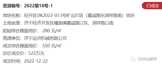 土地位于:济宁经济开发区疃里镇嘉诚路以东、润祥路以南;土地面积:9487㎡(约14亩);土地用途:工业用地;出让年限:50年;容积率不小于1.0;起始价:266万元,综合楼面价起价:280元/㎡;最终成交价为:522元(约37万元/亩),综合楼面地价成交价:550元/㎡;溢价率:96.2%;
