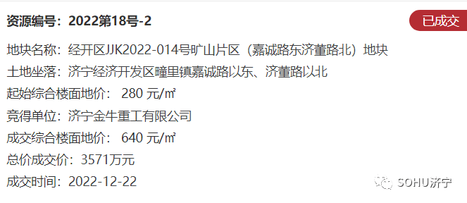 土地位于:济宁经济开发区疃里镇嘉诚路以东、济董路以北;土地面积:55799㎡(约83.7亩);土地用途:工业用地;出让年限:50年;容积率不小于1.0;起始价:1563万元,综合楼面价起价:280元/㎡;最终成交价为:3571元(约43万元/亩),综合楼面地价成交价:640元/㎡;溢价率:128.5%;