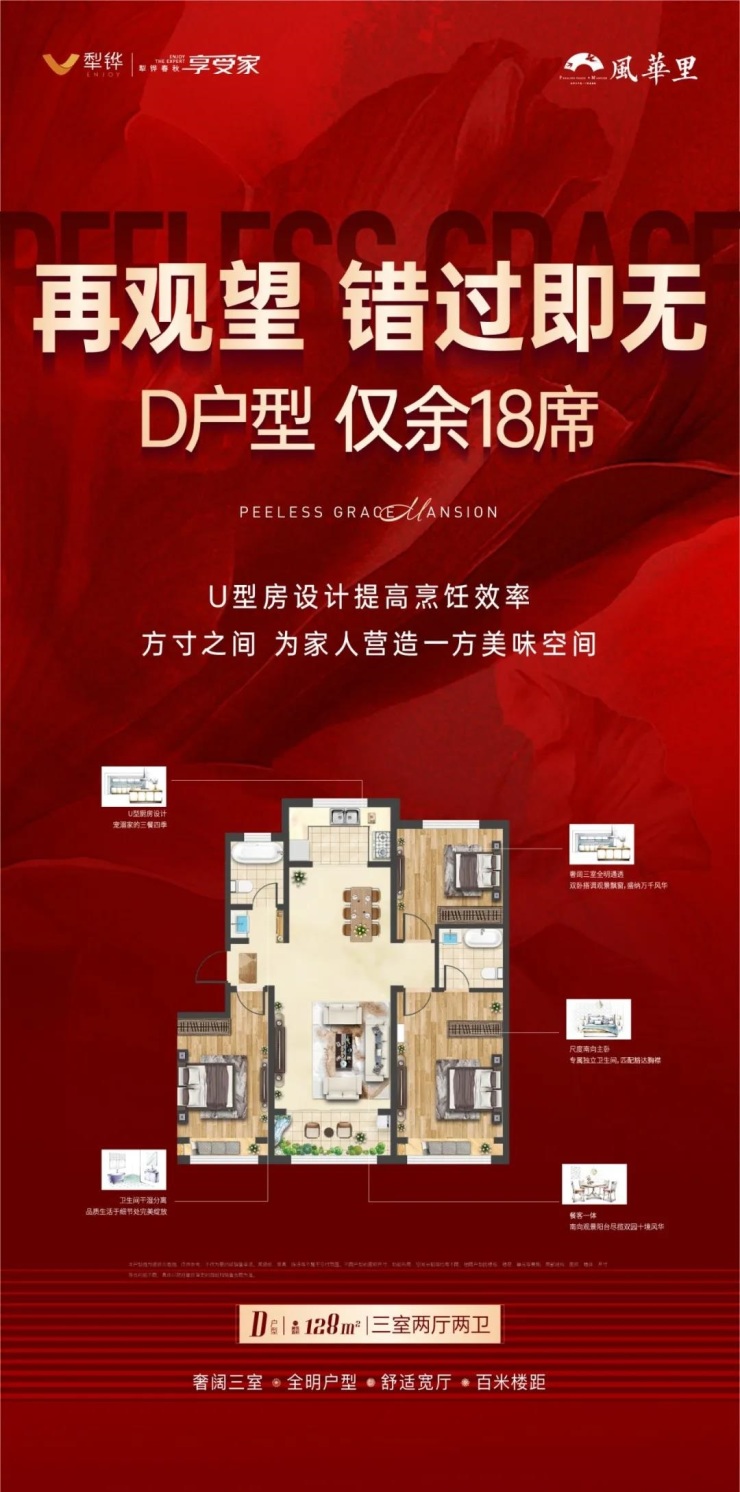 犁铧春秋风华里D户型,仅余18席。U型房设计提高烹饪效率。方寸之间,为家人营造一方美味空间。