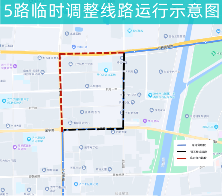 5路临时绕行路段沿任城大道运营至火炬路向南恢复原线路运营。暂不经过长虹路机电路、长虹小区、创新大厦、置城8号公馆站点,临时停靠任兴信息产业园、任兴信息产业园(西)、置城国际中心站点。