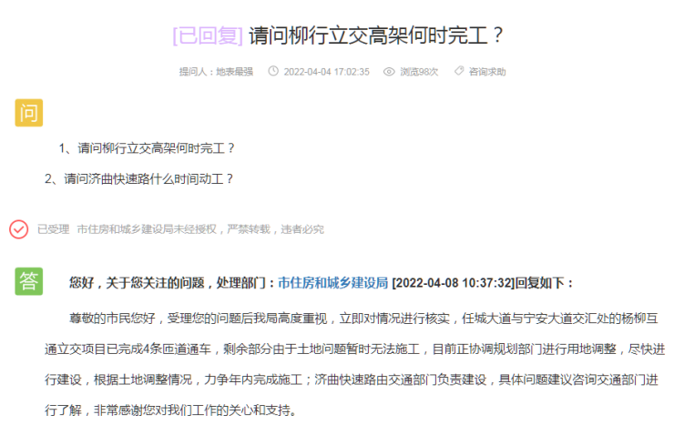 近日,搜狐网济宁小编在济宁市网络问政平台上注意到有网友提问:1、请问柳行立交高架何时完工?2、请问济曲快速路什么时间动工?