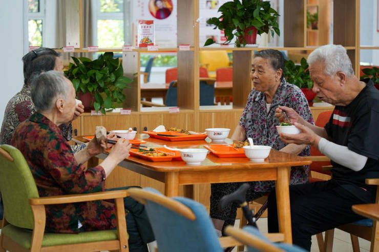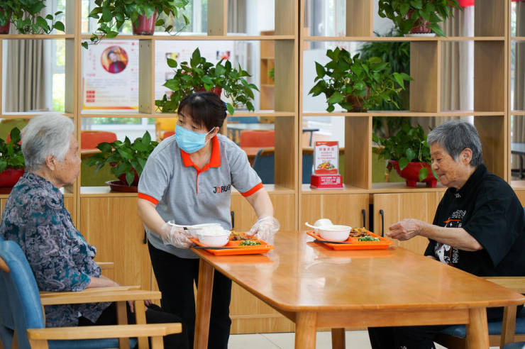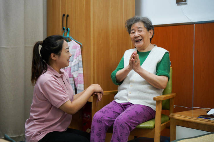 在现场,九如城航运康养中心社工赵娜端着饭菜走到85岁高龄的邵奶奶身旁,蹲下身子,和她亲切地聊了起来。邵奶奶笑得十分开心,表示,“在这里住了两年多,感觉非常好,房间也总是收拾得干干净净。我有个小提议,想和院长说说,我希望能教大家一起练健身操。我从二十年前就开始练,一直坚持到现在,希望能带动大家一起锻炼,增强体质。”在九如城航运康养中心,服务人员不仅提供超出分级标准的照顾服务,更是视老人如亲人一般对待。