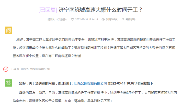 近日,搜狐网济宁小编在济宁市网络问政平台注意到有网友提问:济宁南二环大车多对于老百姓来说不安全,堵脏乱不利于出行,济邹高速最近的新闻也开始进行了准备工作,想咨询贵单位今年大概什么时间动工?现在路线图出来了没有?详细了解太白湖区石桥段的大致走向是?石桥服务区在哪个位置,是在南二环南临还是?