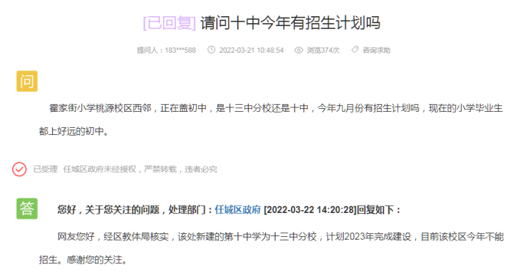 对此,任城区政府回复如下:经区教体局核实,该处新建的第十中学为十三中分校,计划2023年完成建设,目前该校区今年不能招生。
