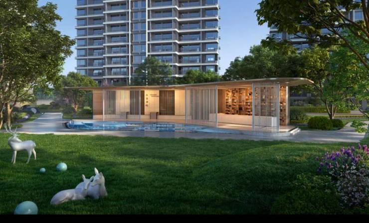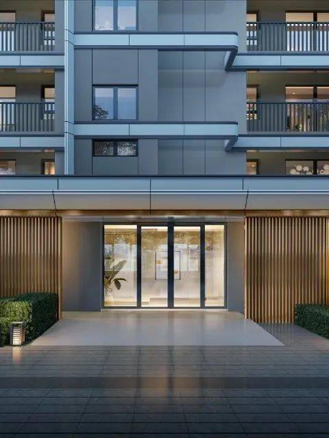 项目建筑立面采用经久不衰的莫兰迪灰,整体超未来流体立面运用具有质感的超大流光玻璃窗与窗墙比,延伸空间视野与采光面积,赋予沉浸式绝美的景观体验,打造同步世界审美的时代作品。最宽楼间距达到约 105 米,充分考量每一栋楼的采光与通风,拥抱更多阳光与清风。