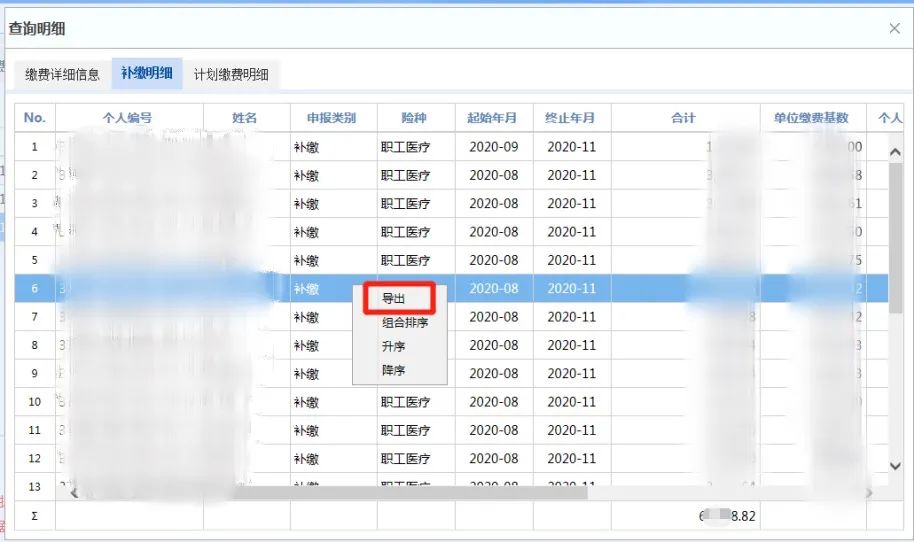在补缴明细页面,单击鼠标右键后选择“导出”后并下载补差及退费明细表。