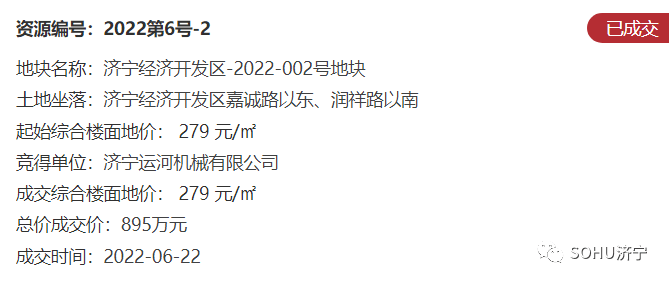 土地位于:济宁经济开发区嘉诚路以东、润祥路以南;土地面积:32059㎡(约48亩);土地用途:工业用地;出让年限:50年;容积率不小于1.0;起始价:895万元,综合楼面价起价:279元/㎡;最终成交价为:895万元(约18.6万元/亩),综合楼面地价成交价:279元/㎡;溢价率:0.0%;
