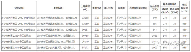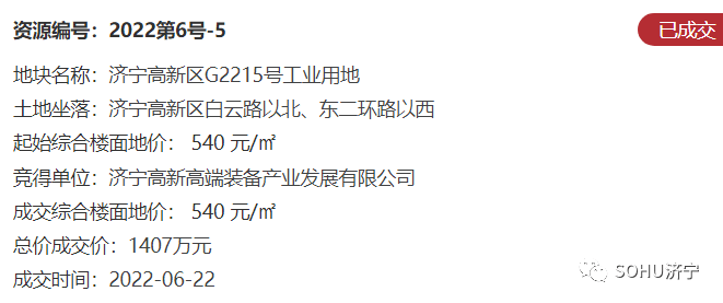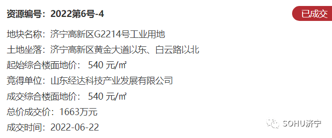 土地位于:济宁高新区黄金大道以东、白云路以北;土地面积:30788㎡(约46.18亩);土地用途:工业用地;出让年限:50年;容积率不小于1.0;起始价:1663万元,综合楼面价起价:540元/㎡;最终成交价为:1663万元(约36万元/亩),综合楼面地价成交价:540元/㎡;溢价率:0.0%;