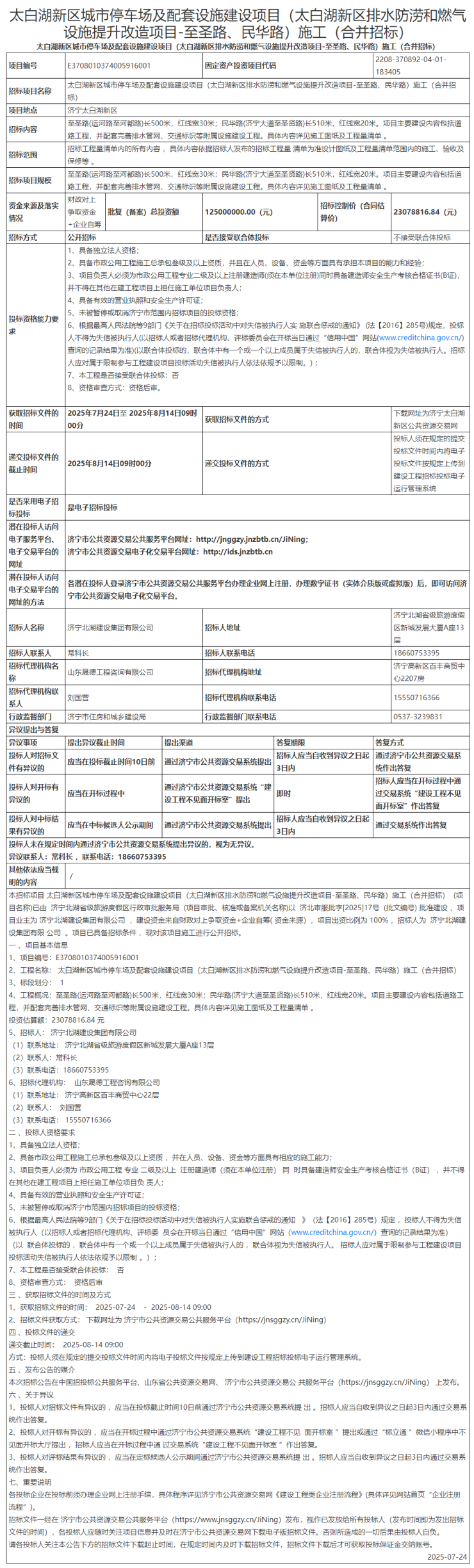 本招标项目太白湖新区城市停车场及配套设施建设项目(太白湖新区排水防涝和燃气设施提升改造项目-至圣路、民华路)施工(合并招标)(项目名称)已由济宁北湖省级旅游度假区行政审批服务局(项目审批、核准或备案机关名称)以济北审服批字[2025]17号(批文编号)批准建设,项目业主为济宁北湖建设集团有限公司,建设资金来自财政对上争取资金+企业自筹(资金来源),项目出资比例为100%,招标人为济宁北湖建设集团有限公司。项目已具备招标条件,现对该项目施工进行公开招标。