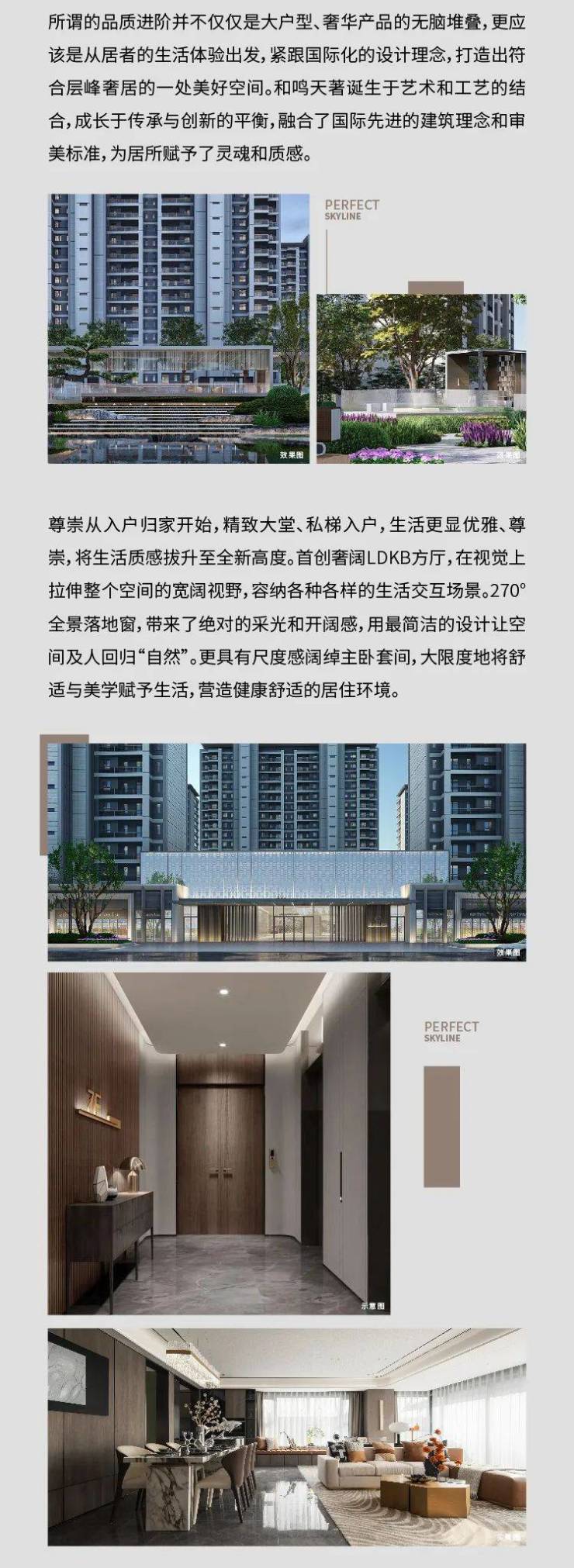 尊崇从入户归家开始,城投泽信·和鸣天著精致大堂、私梯入户,生活更显优雅、尊崇,将生活质感拔升至全新高度。首创奢阔LDKB方厅,在视觉上拉伸整个空间的宽阔视野,容纳各种各样的生活交互场景。270°全景落地窗,带来了绝对的采光和开阔感,用最简洁的设计让空间及人