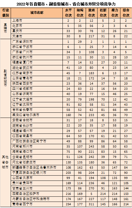 由“外贸总值占全国比重”“外贸依存度”“外贸企业质量”“出口发展优势”4个三级指标构成。“外贸总值占全国比重”反映城市进出口规模以及对全国外贸的贡献程度;“外贸依存度”反映当地经济发展对外贸的依赖和参与国际分工程度;“外贸企业质量”由“外贸企业数量”和“外贸500强企业数量”两个四级指标构成,其中“外贸企业数量”体现城市外贸活力,“外贸500强企业数量”体现城市外贸实力,两者共同决定该城市的外贸企业发展水平;“出口发展优势”由“出口增速”和“出口增加值”两个四级指标构成,只有兼具“增速快”且“增量大”,该项指标才能获得提升。