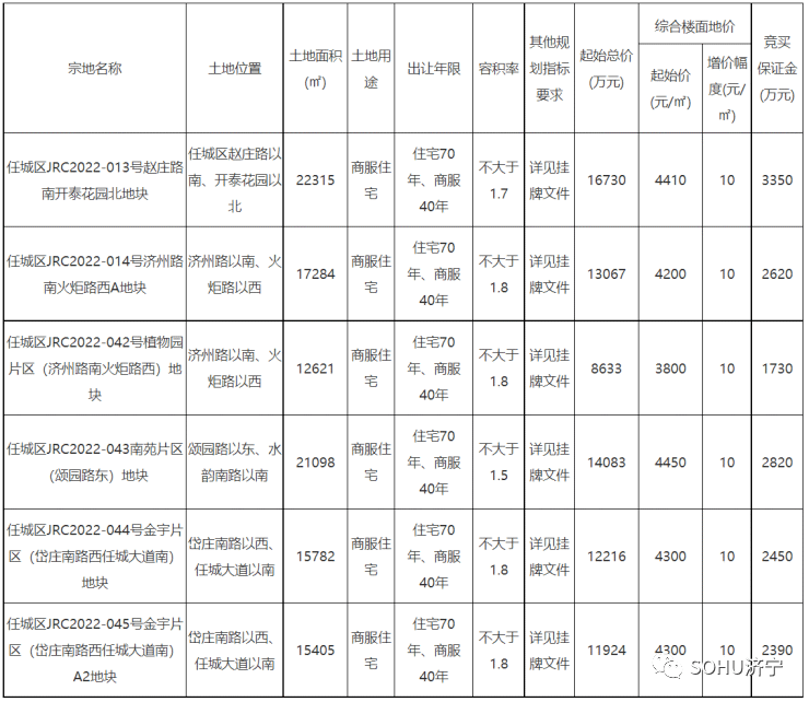 土地位于:岱庄南路以西、任城大道以南;土地面积:15405㎡(约23亩);土地用途:商住用地;出让年限:商业40年、住宅70年;容积率不大于1.8;起始价:11924万元,综合楼面价起价:4300元/㎡;最终成交价为:11924元(约518万元/亩),综合楼面地价成交价:4300元/㎡;溢价率:0.0%;