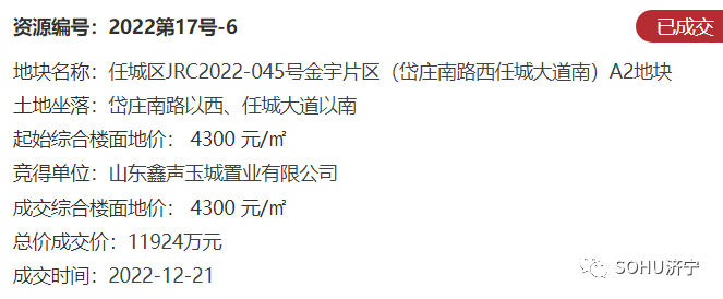 土地位于:岱庄南路以西、任城大道以南;土地面积:15782㎡(约23.7亩);土地用途:商住用地;出让年限:商业40年、住宅70年;容积率不大于1.8;起始价:12216万元,综合楼面价起价:4300元/㎡;最终成交价为:12216元(约515万元/亩),综合楼面地价成交价:4300元/㎡;溢价率:0.0%;