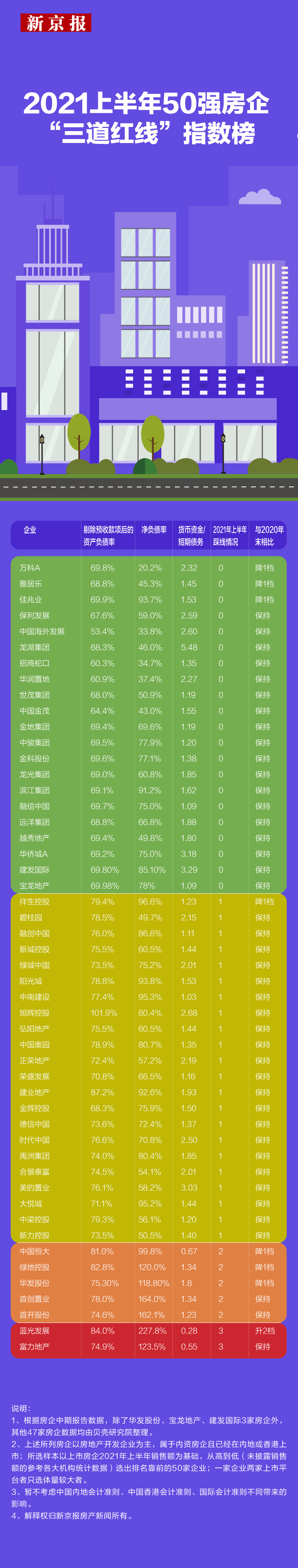 以销售规模50强房企为基础,基于贝壳研究院统计数据,新京报房产新闻整理推出《2021年上半年50强房企“三道红线”指数榜》(简称“榜单”)。从榜单来看,今年上半年,各大房企通过加速销售回款、减少拿地、调整融资结构等持续降杠杆、降负债,50强房企中,21家房企位列“绿档”,22家房企为“黄档”,5家房企为“橙档”,2家房企为“红档”。