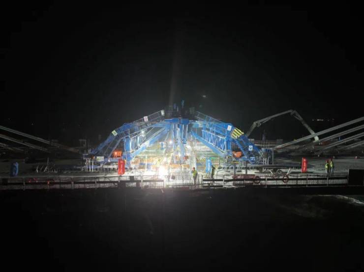 深夜的新万福河畔,焊花如星,泵车轰鸣,混凝土顺着钢筋骨架倾泻而下。新万福河特大桥作为济商高速全线关键控制性工程,桥梁全长882米,主桥长395米,桥面宽35.5米,主塔高度32米,主梁结构为大断面,为塔梁固结、塔墩分离结构体系。