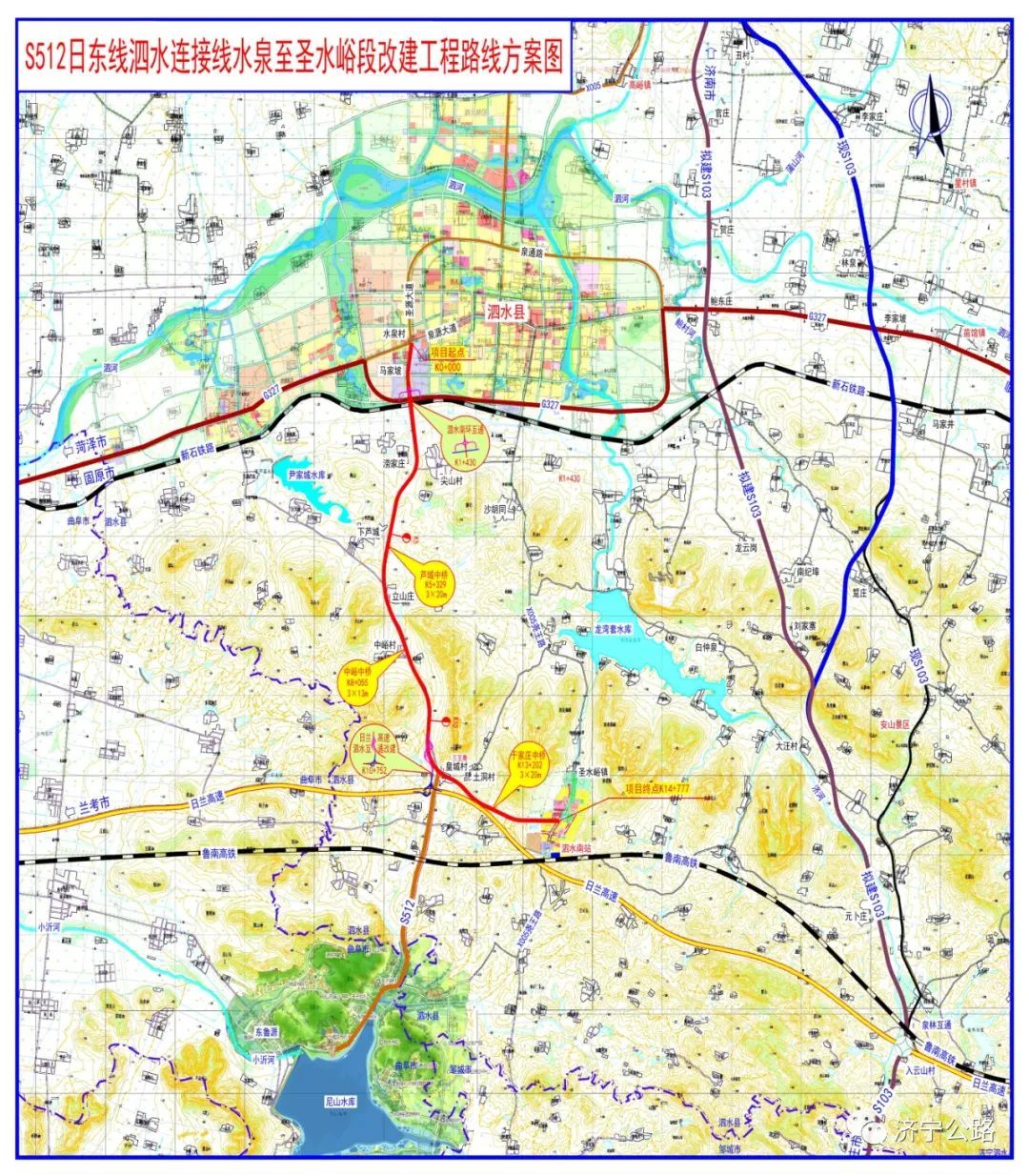 S512日东线泗水连接线水泉至圣水峪段改建项目起自泗水县水泉村圣源大道与泉源大道交叉处,止于圣水峪镇西规划的X005尧王路,通过X005尧王路与鲁南高铁泗水南站广场环线相连接;全长14.777公里(新建段长3.467公里、改造利用段长11.31公里),采用一级公路标准,设计时速80公里/小时,路基宽度25.5米,全线共设中桥159米/3座、涵洞35道、互通立交2处(泗水南环互通立交、日兰高速泗水互通立交)、天桥160米/3座、平面交叉10处、养护工区1处;施工图预算核定为8.22亿元,建设总工期24个月。项目建成后可有效联接日兰高速、鲁南高铁泗水南站、泗水县城及尼山圣境景区,对优化区域路网布局,提升干线公路服务水平,发挥鲁南高铁集疏运功能,促进沿线经济、旅游、社会发展等具有重要意义。