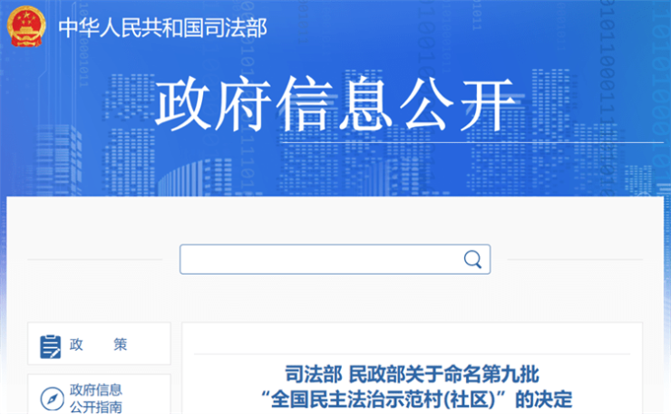 1月16日,司法部官网发布《司法部 民政部关于命名第九批“全国民主法治示范村(社区)”的决定》,决定命名1136个村(社区)为第九批“全国民主法治示范村(社区)”。其中,济宁7个村(社区)上榜。详细名单如下: