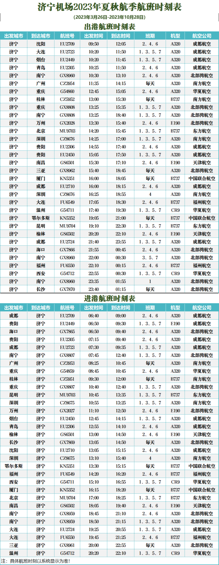 3月26日,济宁机场正式执行夏秋航季。2023年夏秋航季时间为3月26日至10月28日。