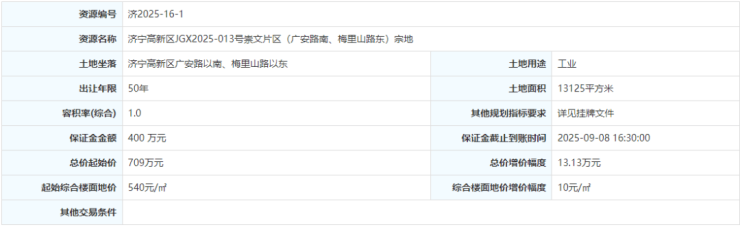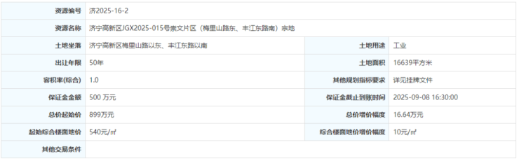 土地位于:济宁高新区梅里山路以东、丰江东路以南;土地面积:16639㎡(约25亩);土地用途:工业用地;出让年限:50年;容积率不小于1.0;起始价:899万元,综合楼面价起价:540元/㎡;