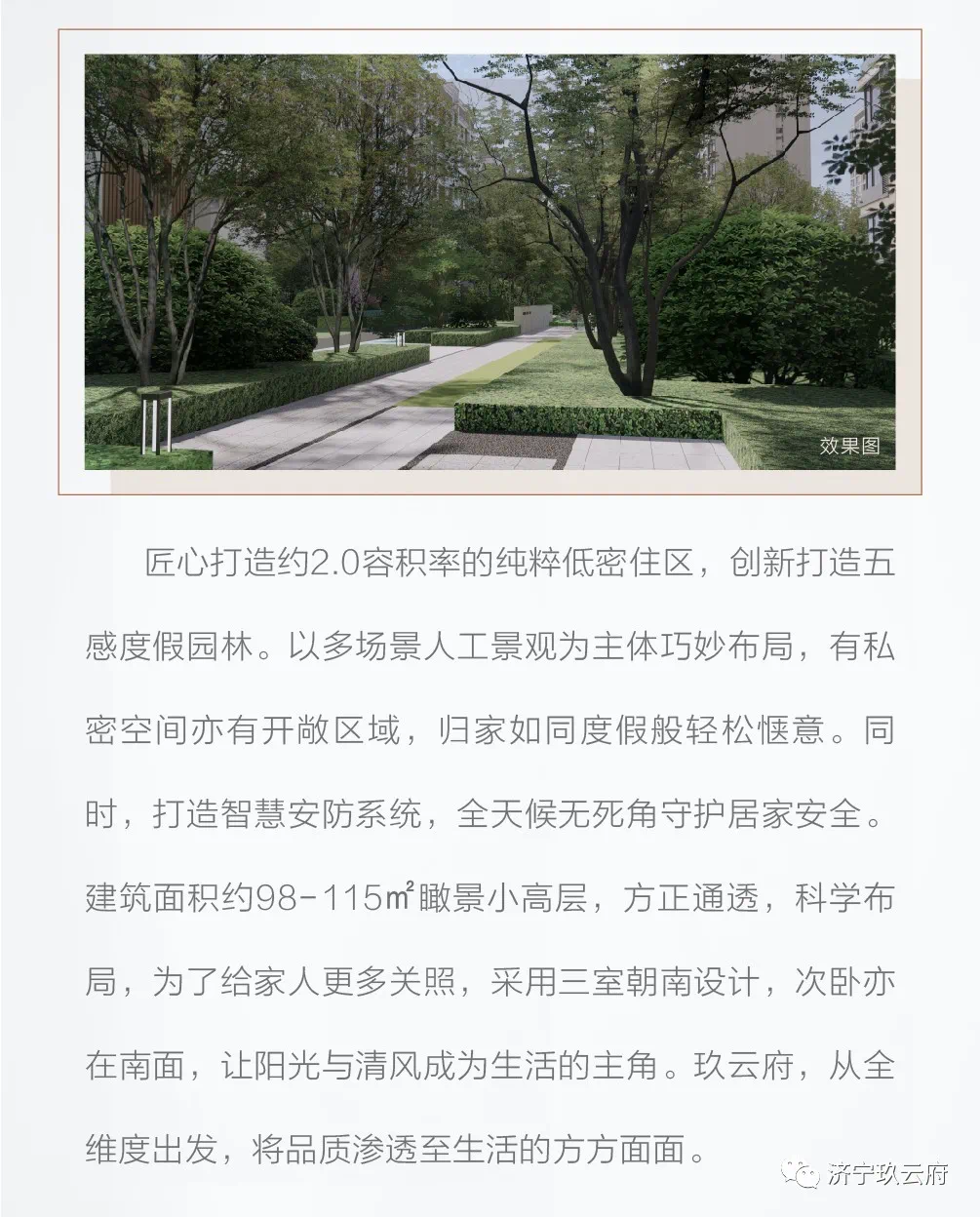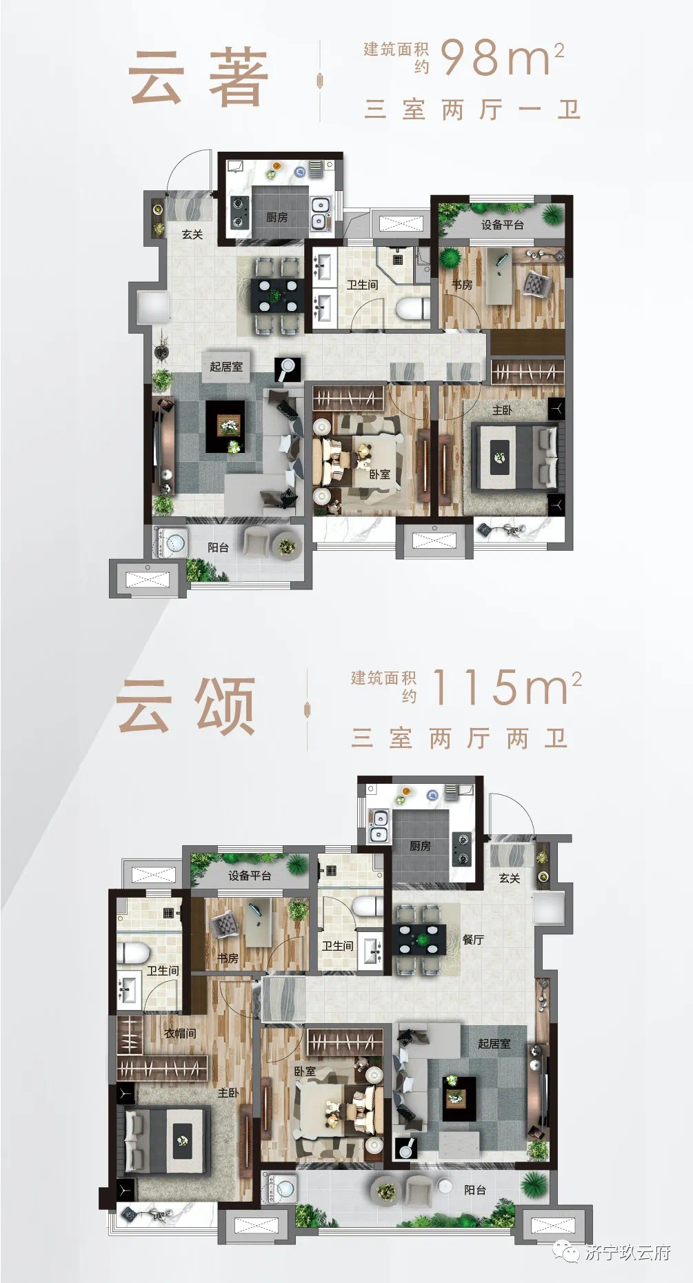 玖云府匠心打造约2.0容积率的低密住区,创新打造五感度假园林。以多场景人工景观为主体巧妙布局,有私密空间亦有开敞区域,归家如同度假般轻松惬意。同时,打造智慧安防系统,全天候无死角守护居家安全。建筑面积约98-115㎡瞰景小高层,方正通透,科学布局,为了给家人更多关照,采用三室朝南设计,次卧亦在南面。