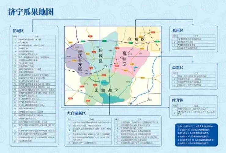 今年,济宁市主城区精心设置了57个应季瓜果临时销售点,其中,任城区33个、兖州区4个、济宁高新区4个、太白湖新区14个、济宁经开区2个,具体点位如下: