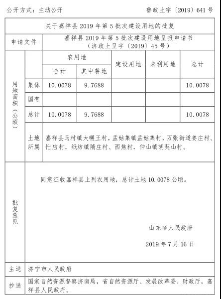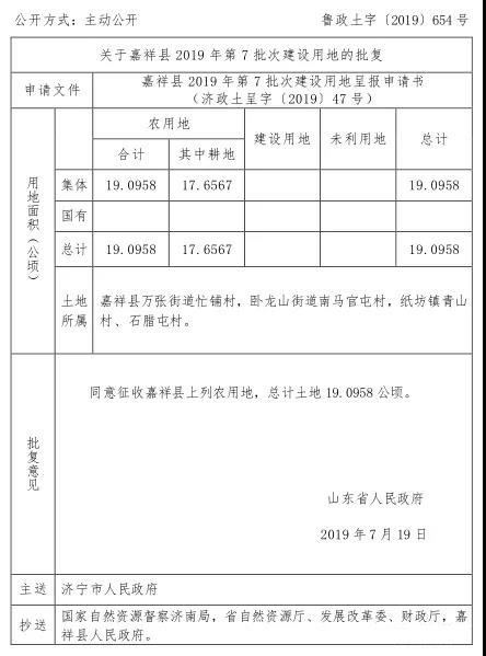 批复意见:同意征收嘉祥县上列农用地,总计土地 19.0958 公顷。