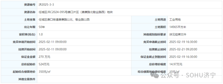 3. 任城区JRC2024-095号唐口片区(唐廉路北敬业路西)地块:2025年2月11日9时00分至2025年2月21日9时20分;