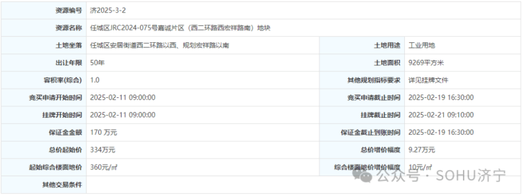 土地位于:任城区安居街道西二环路以西、规划宏祥路以南;土地面积:9269㎡(约14亩);土地用途:工业用地;出让年限:50年;容积率不小于1.0;起始价:334万元,综合楼面价起价:360元/㎡;