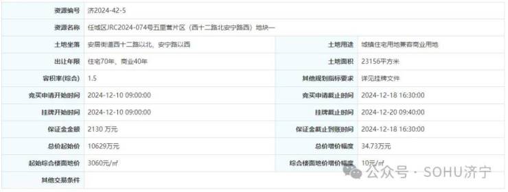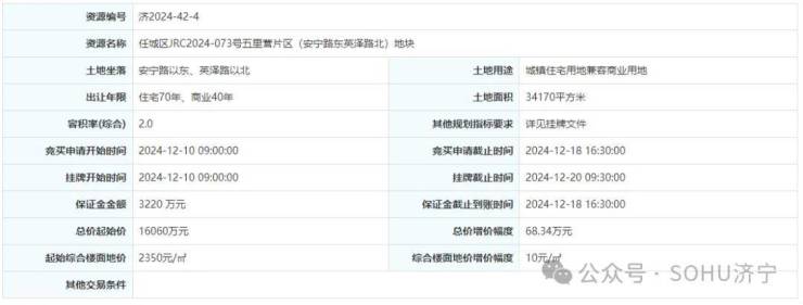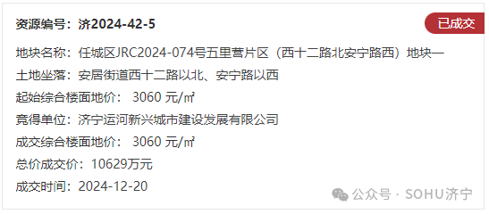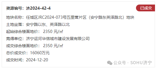 地块四:任城区JRC2024-073号五里营片区(安宁路东英泽路北)地块【济宁运河华信城市建设发展有限公司竞得】